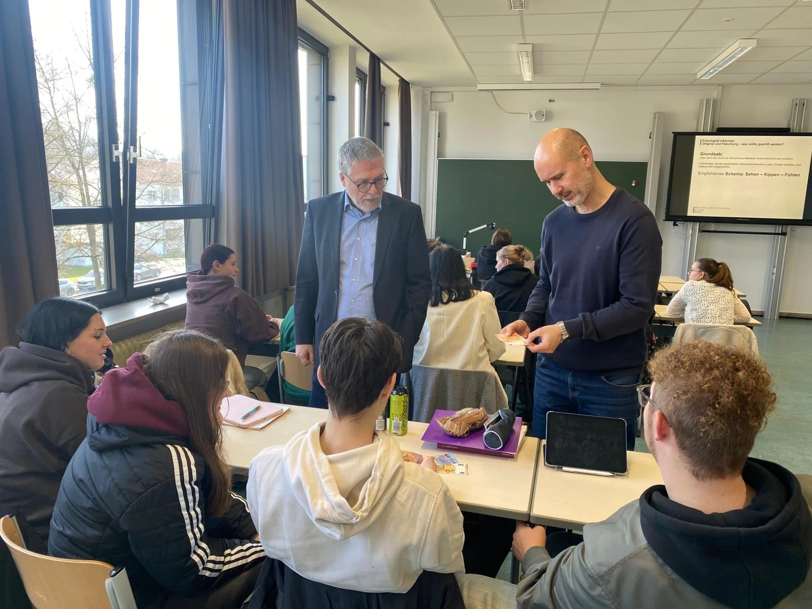 Im praktischen Teil konnten die Lernenden verschiedene Banknoten selbst untersuchen und die Sicherheitsmerkmale direkt erkennen. Anhand von Beispielen zeigte der Referent außerdem, wie Fälschungen aussehen können und worauf besonders im Einzelhandel geachtet werden sollte.